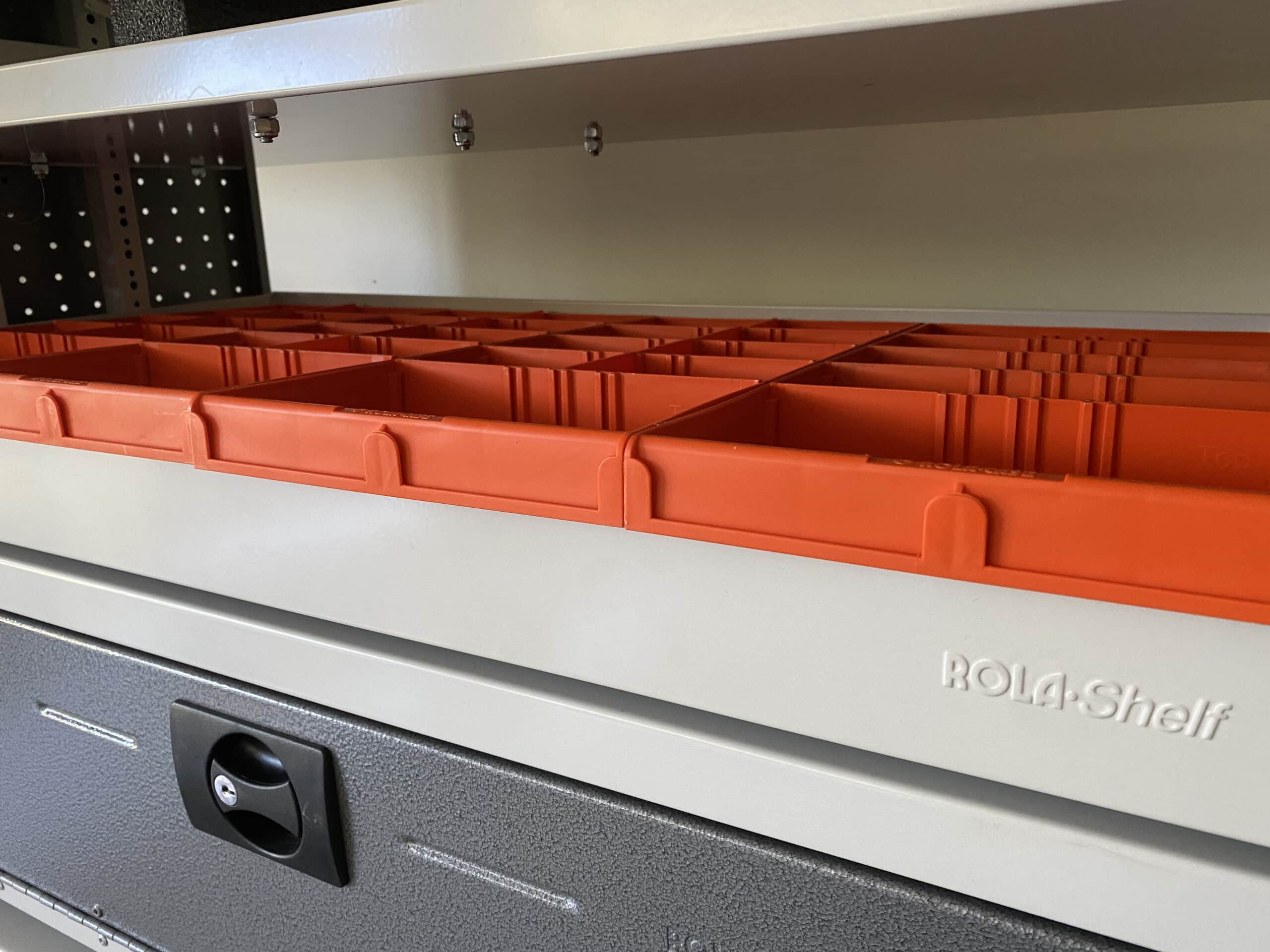 Shelves can be added or substituted for alternative RolaShelf products as your business needs change or grow, & they can be adjusted against the inner wall of your commercial vehicle to allow for maximum walk through space.